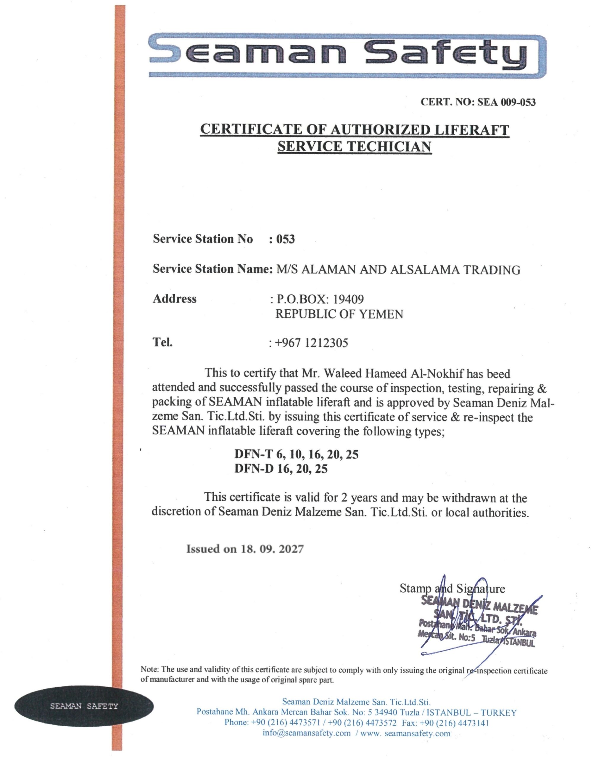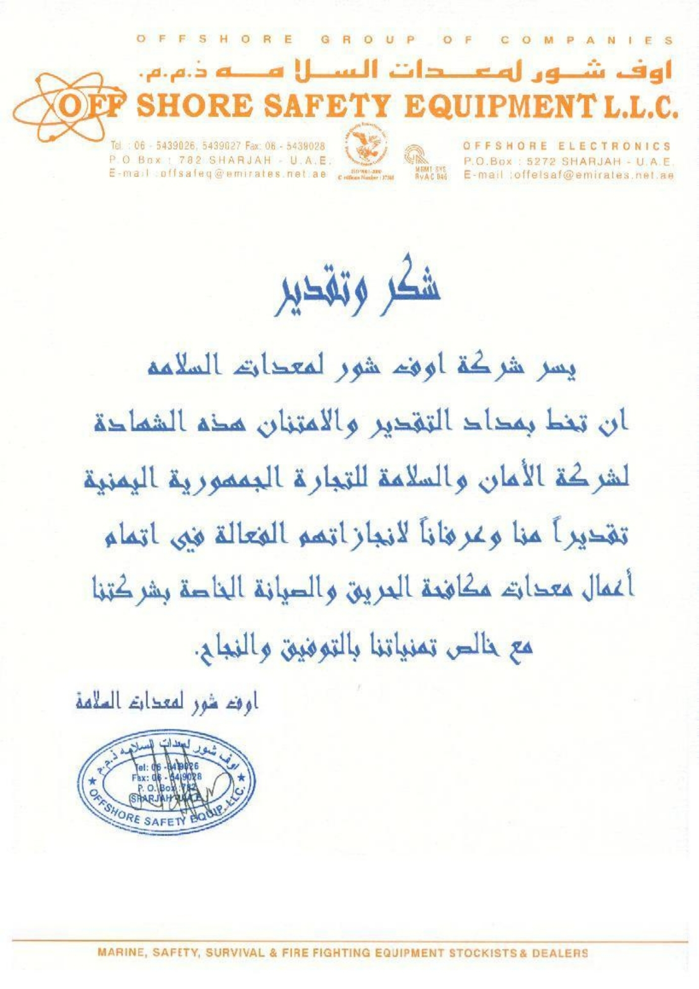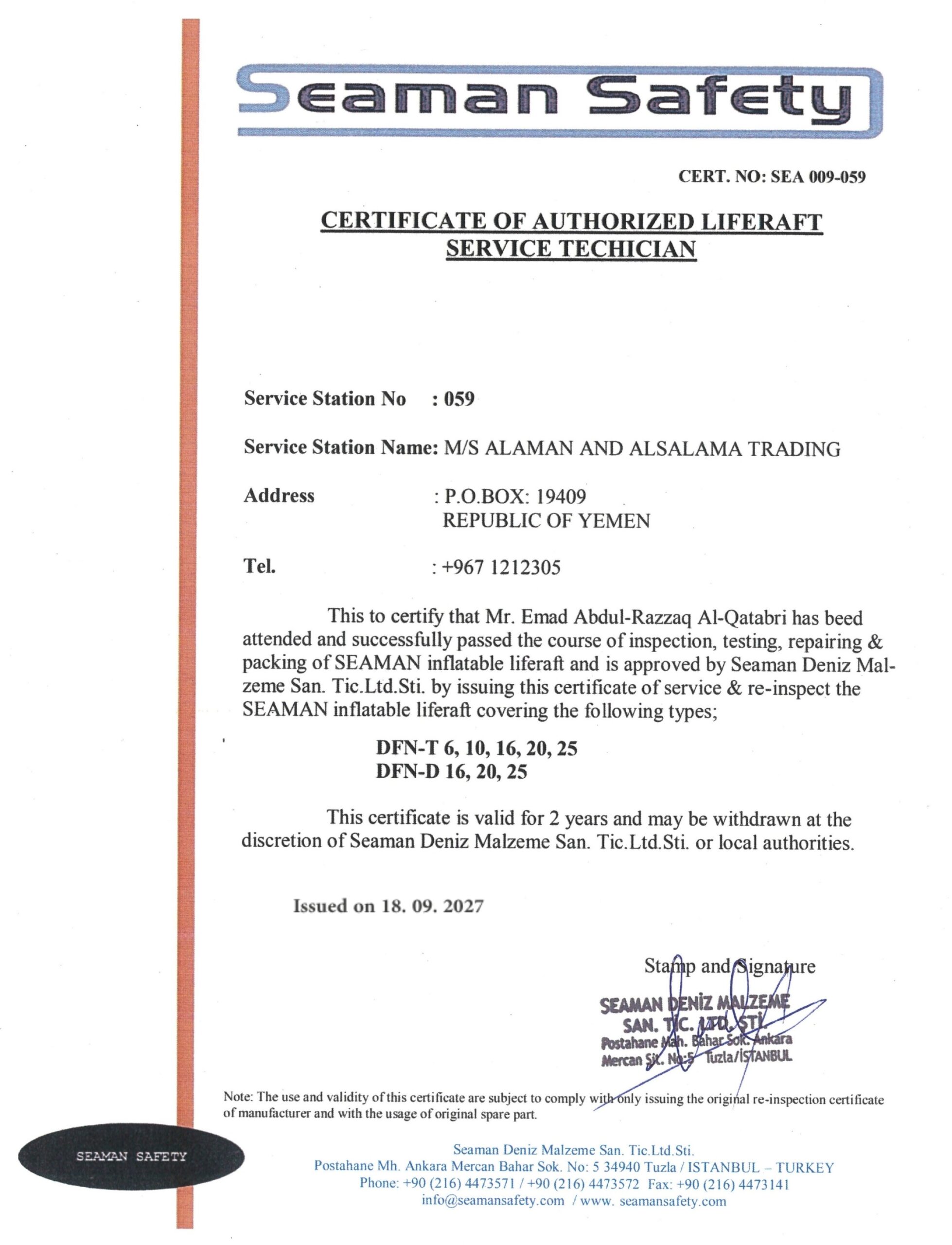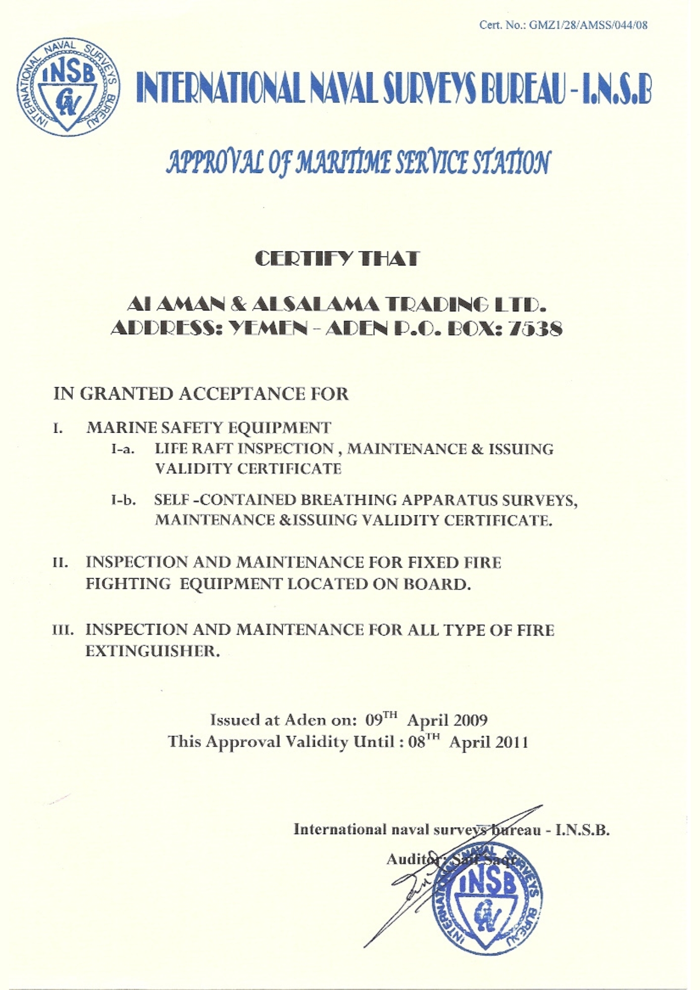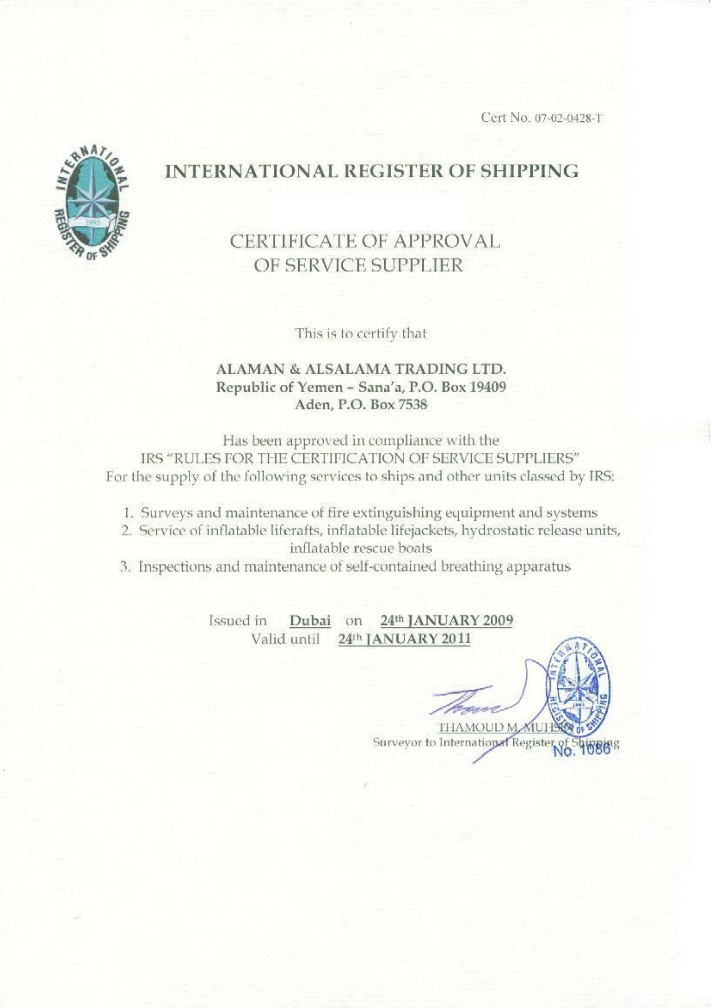 حاصل على العديد من الشهادات المعتمدة من هيئات التصنيف الدولية، وهيئة الشؤون البحرية اليمنية لصيانة معدات السلامة البحرية