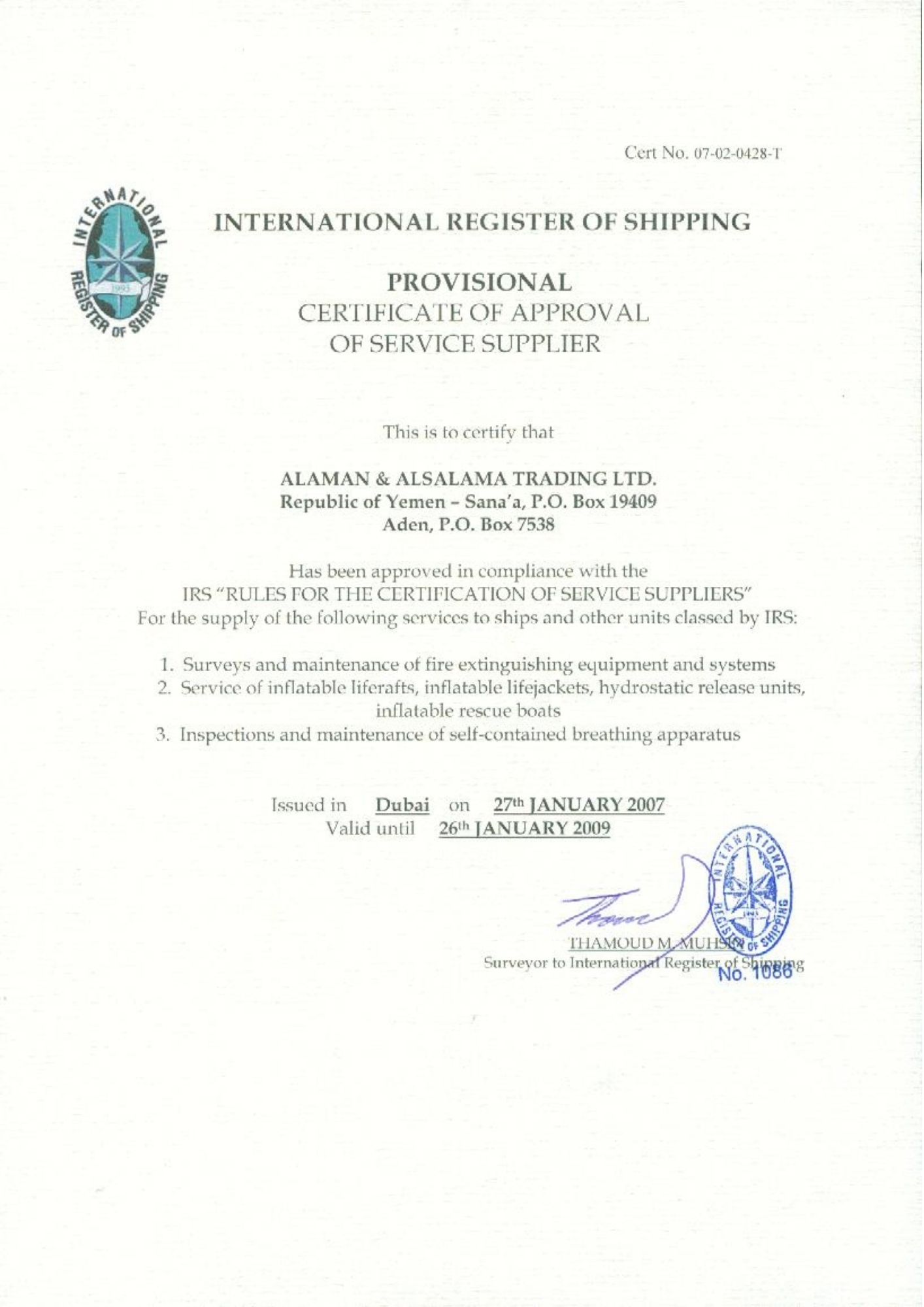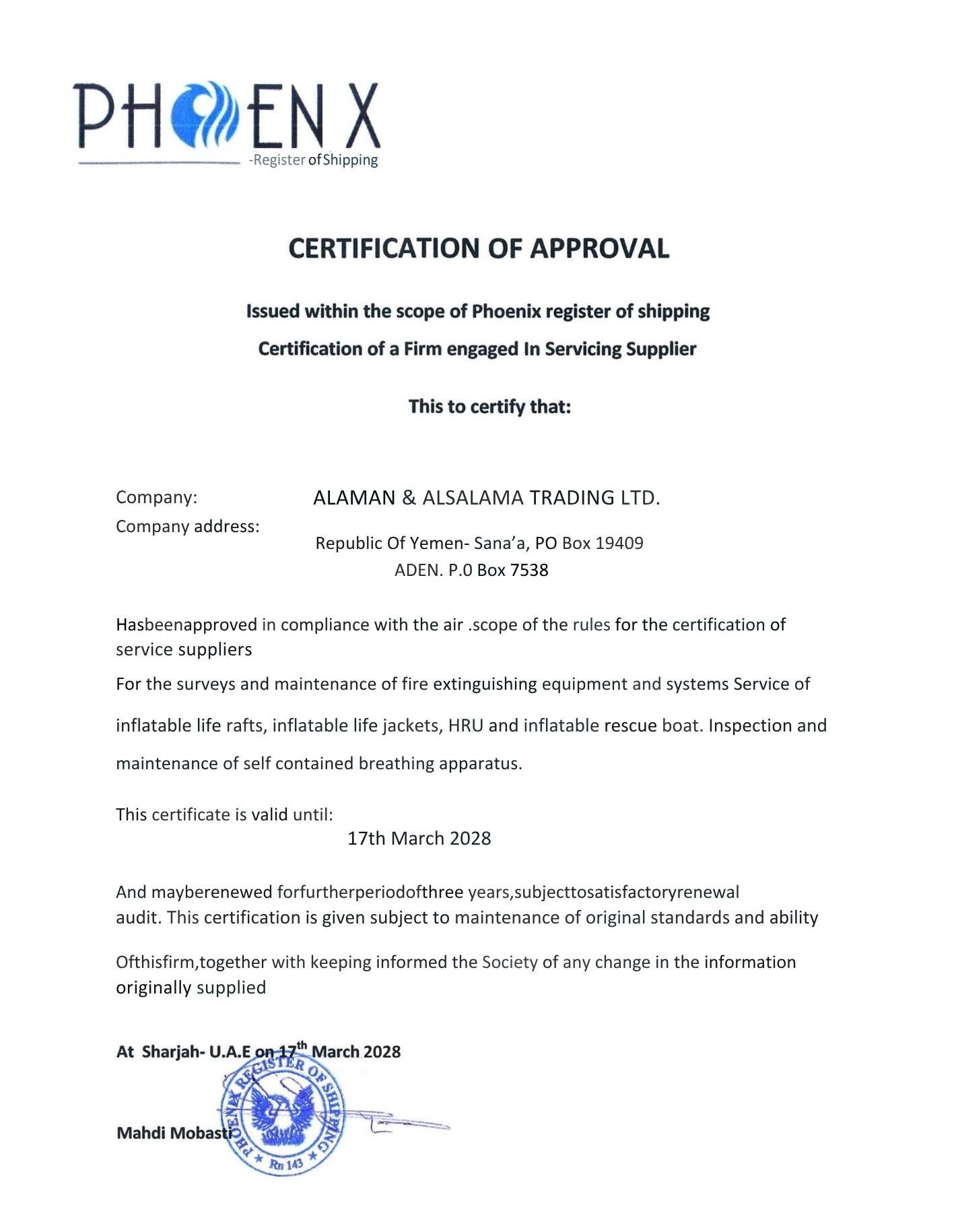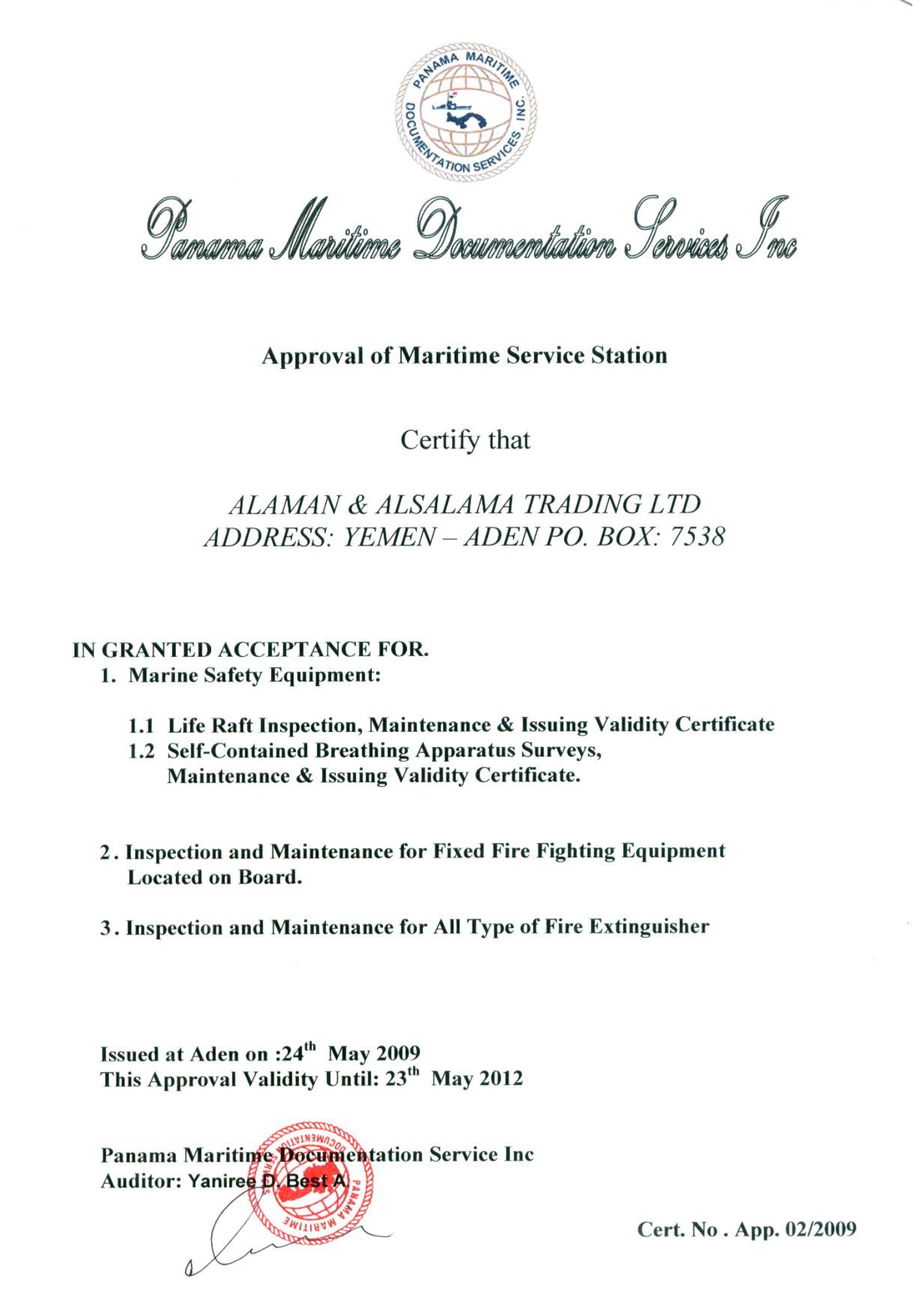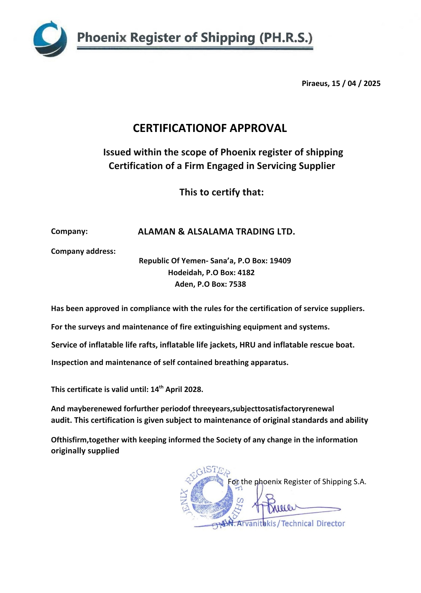 حاصل على العديد من الشهادات المعتمدة من هيئات التصنيف الدولية، وهيئة الشؤون البحرية اليمنية لصيانة معدات السلامة البحرية