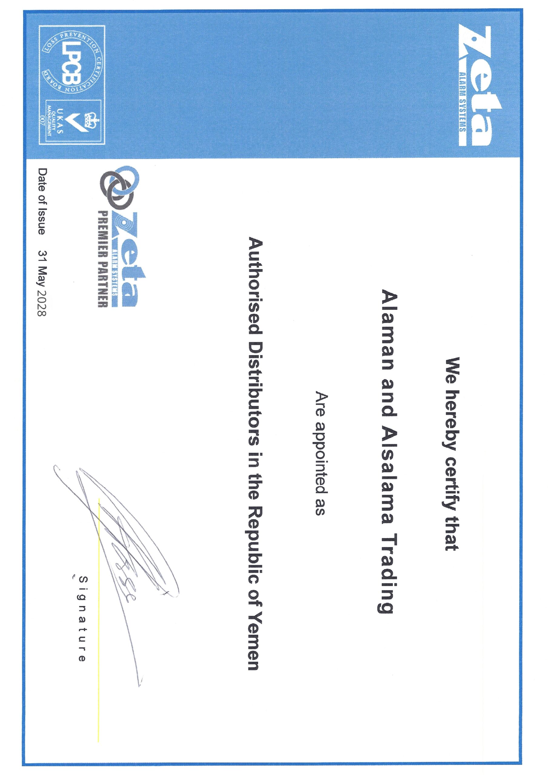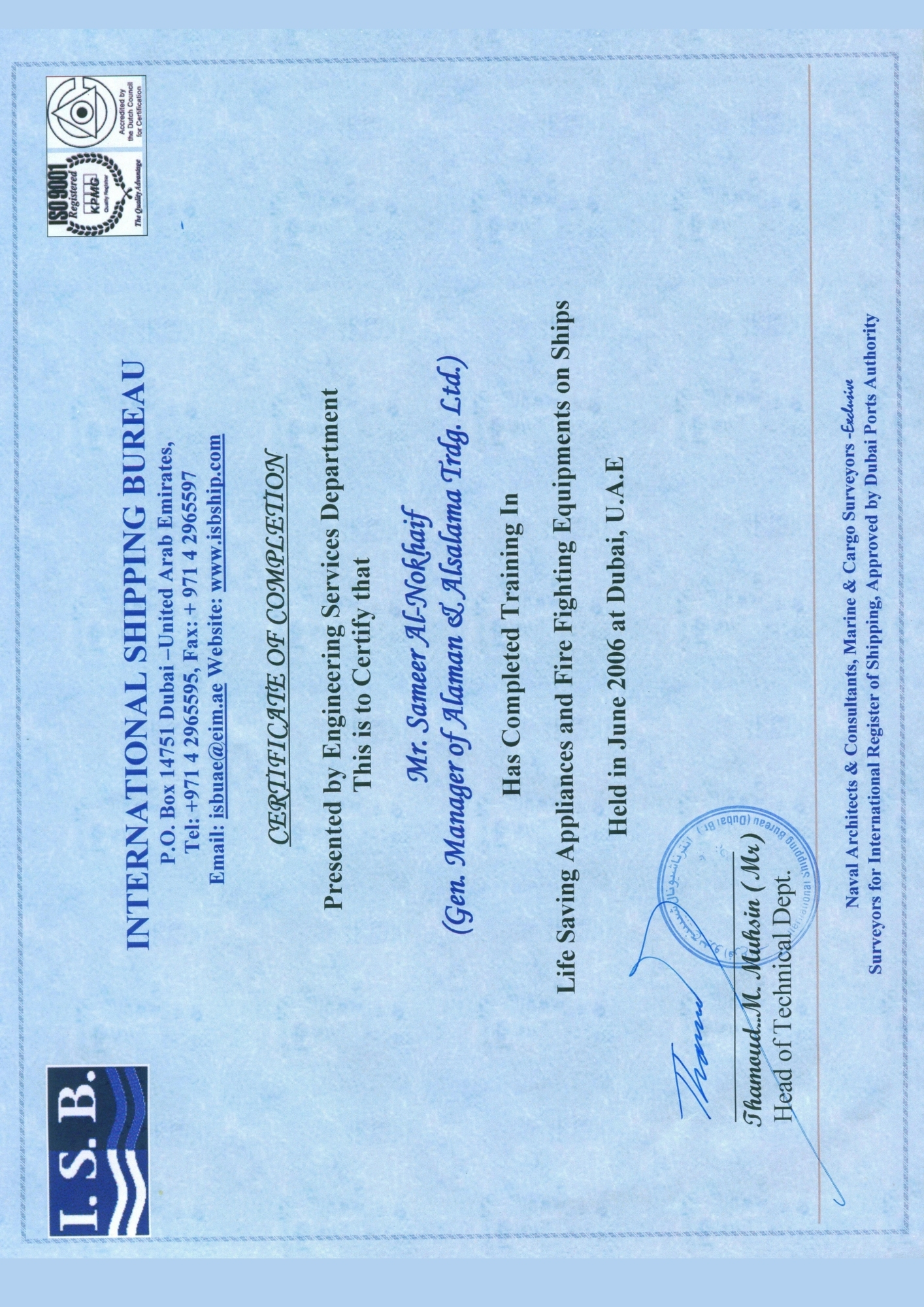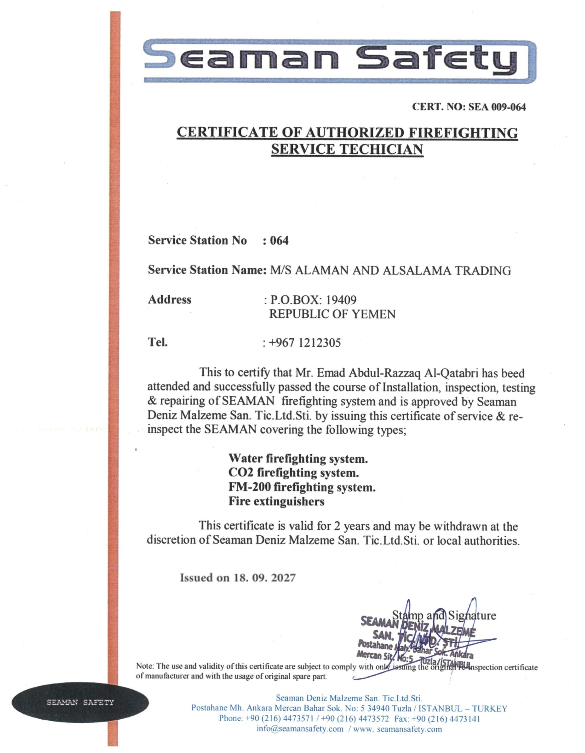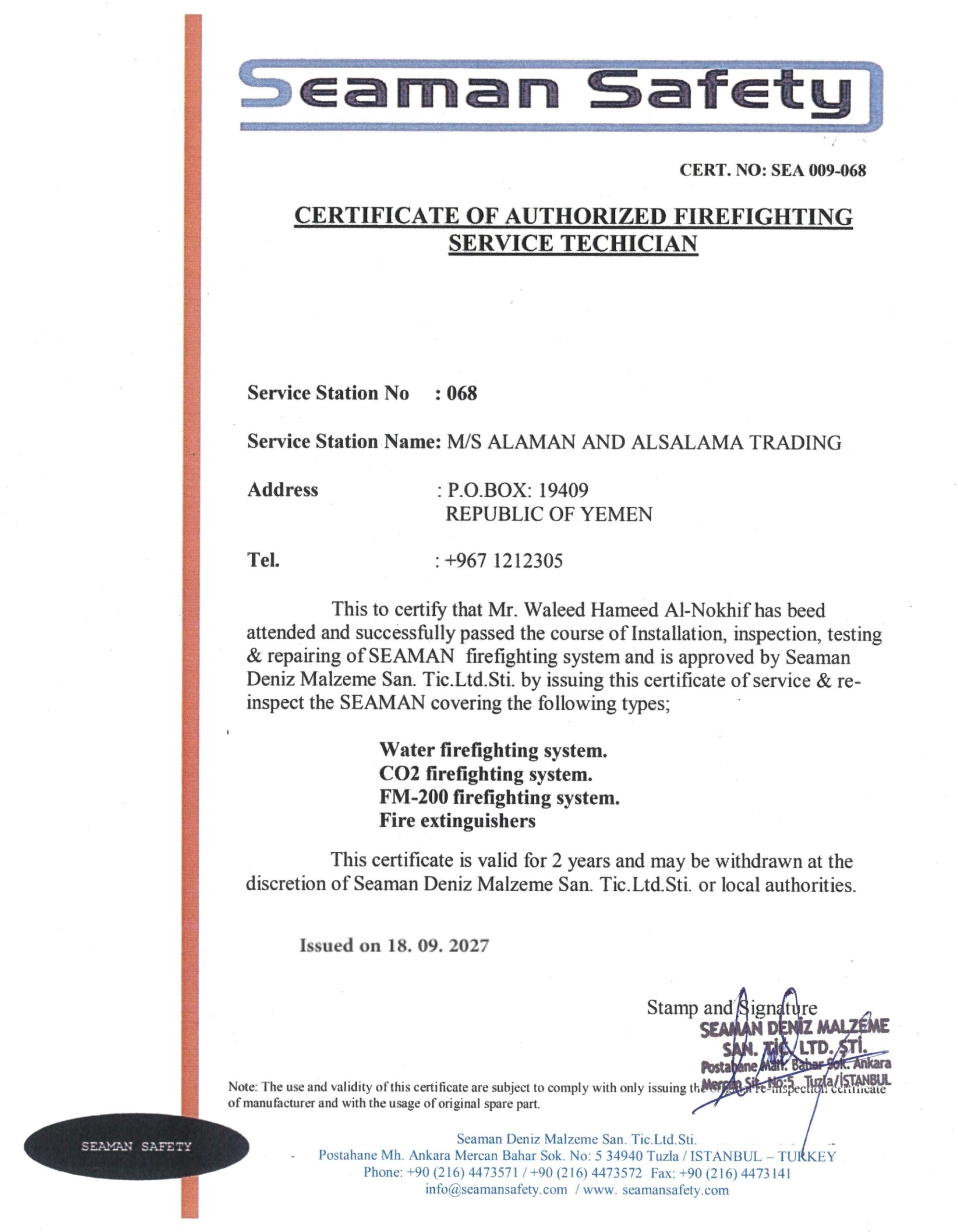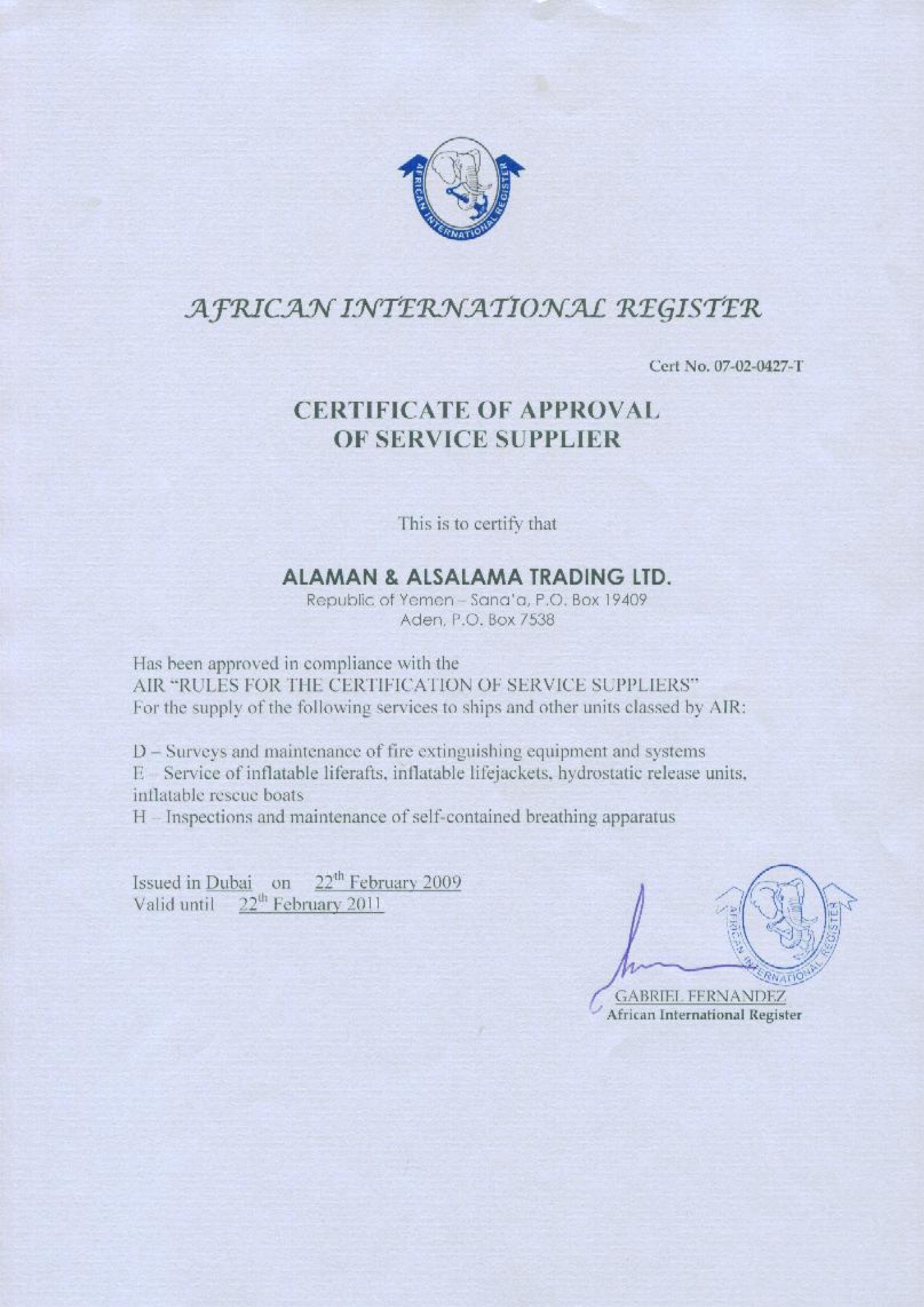حاصل على العديد من الشهادات المعتمدة من هيئات التصنيف الدولية، وهيئة الشؤون البحرية اليمنية لصيانة معدات السلامة البحرية
