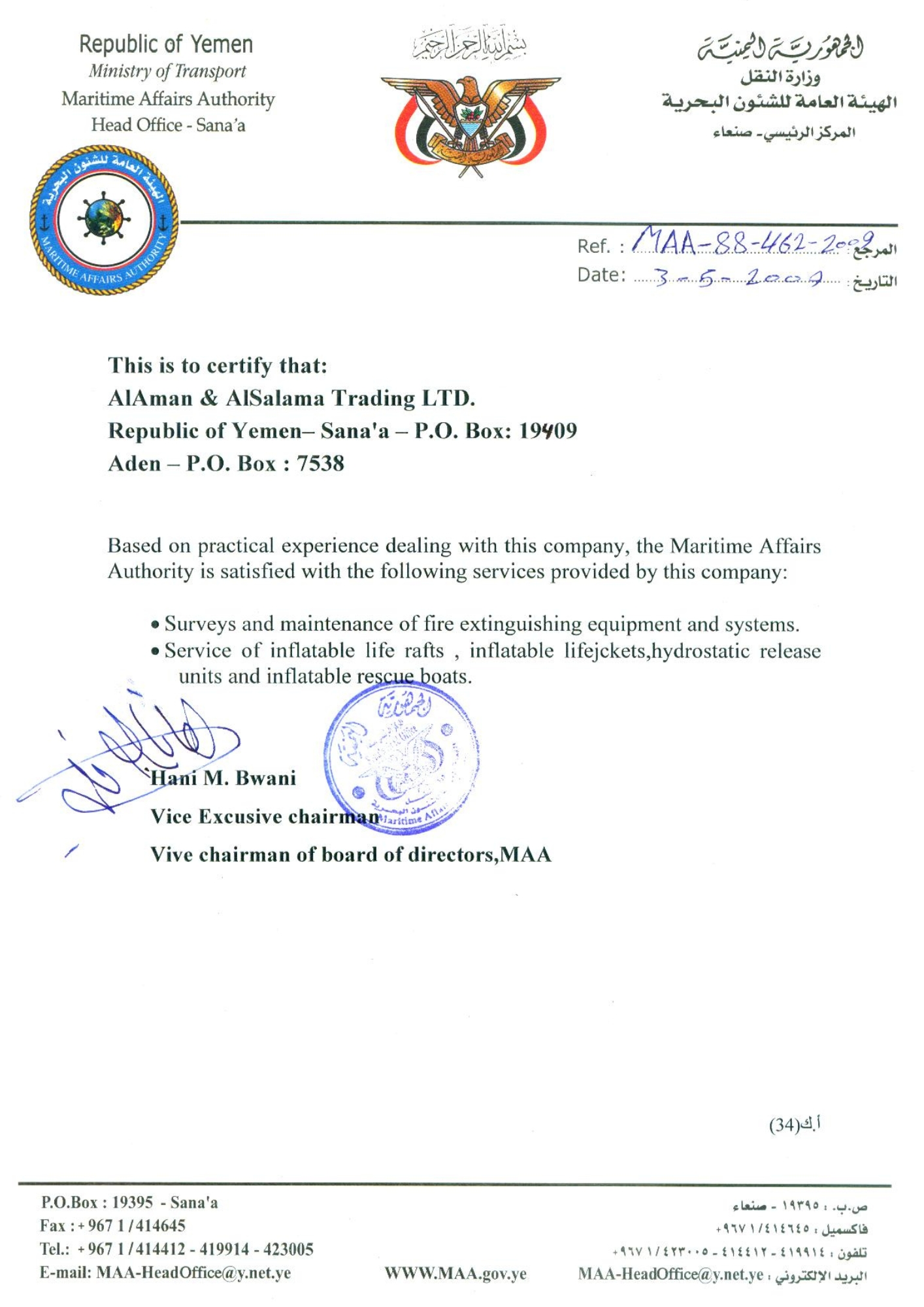 الشركة اليمنية الوحيدة العاملة في مجال السلامة البحرية، والحاصلة على العديد من الشهادات المعتمدة من ICB & YMAA لصيانة معدات السلامة البحرية